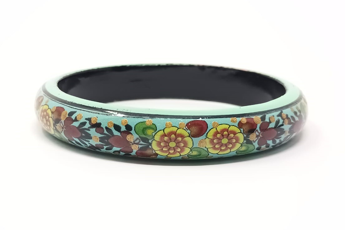 An eye catching wonderful design bangle, crafted by artisans of Kashmir, India. This unique handicraft is an all occasion gift to add grace to any outfit. Thickness: 1/2 Inch Diameter: 2.5 Inch Weight: 25 g Per Bangle