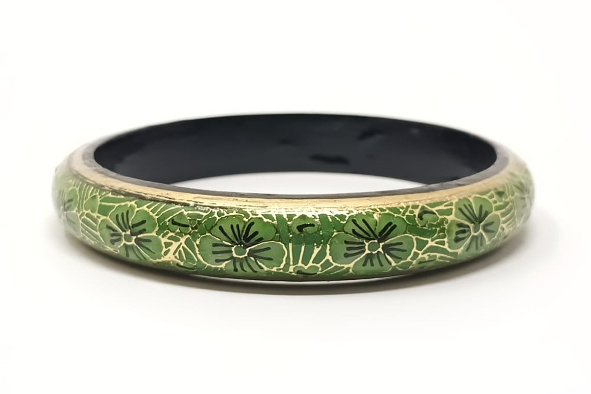 An eye catching wonderful design bangle, crafted by artisans of Kashmir, India. This unique handicraft is an all occasion gift to add grace to any outfit. Thickness: 1/2 Inch Diameter: 2.5 Inch Weight: 25 g Per Bangle